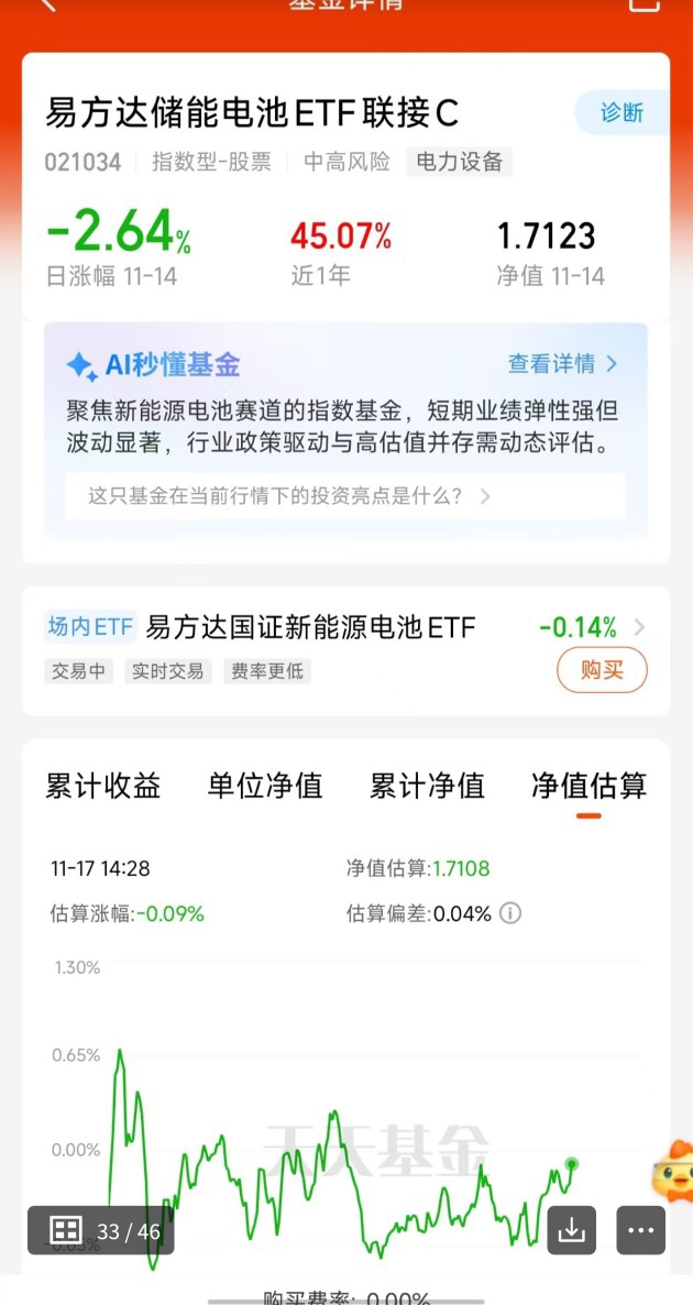 小白求助,刚玩基金不久。看到新能源电池就买了,结果发现同是电池基金,收益差好多。问了群里的大神,说是我买错了,应该买那个投资范围包含储能的指数基金。原来是这样的吗?学问真深啊!$易方达储能电池ETF联接C$