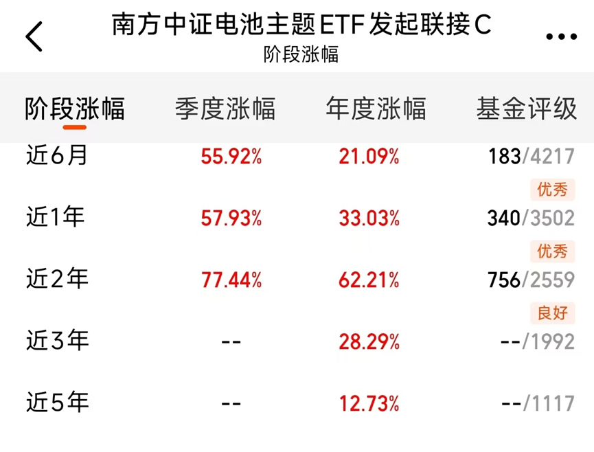 南方中证电池主题ETF发起联接C(018927)覆盖了从材料、生产到设备的全产业链龙头,相当于把赛道里的优质玩家都打包了,能全面分享行业成长红利。 该基金近期表现亮眼,近6月上涨55.92%,近1年上涨57.93%。
