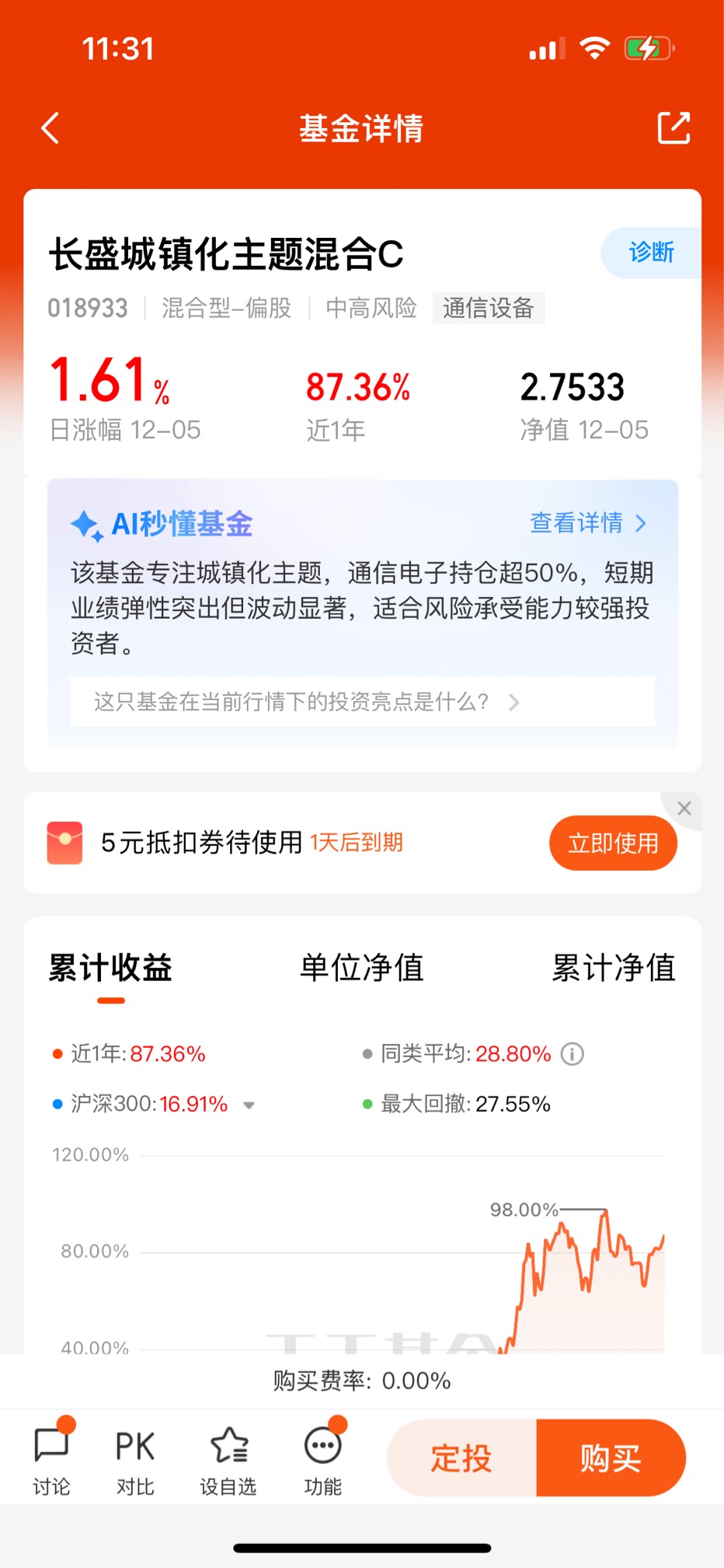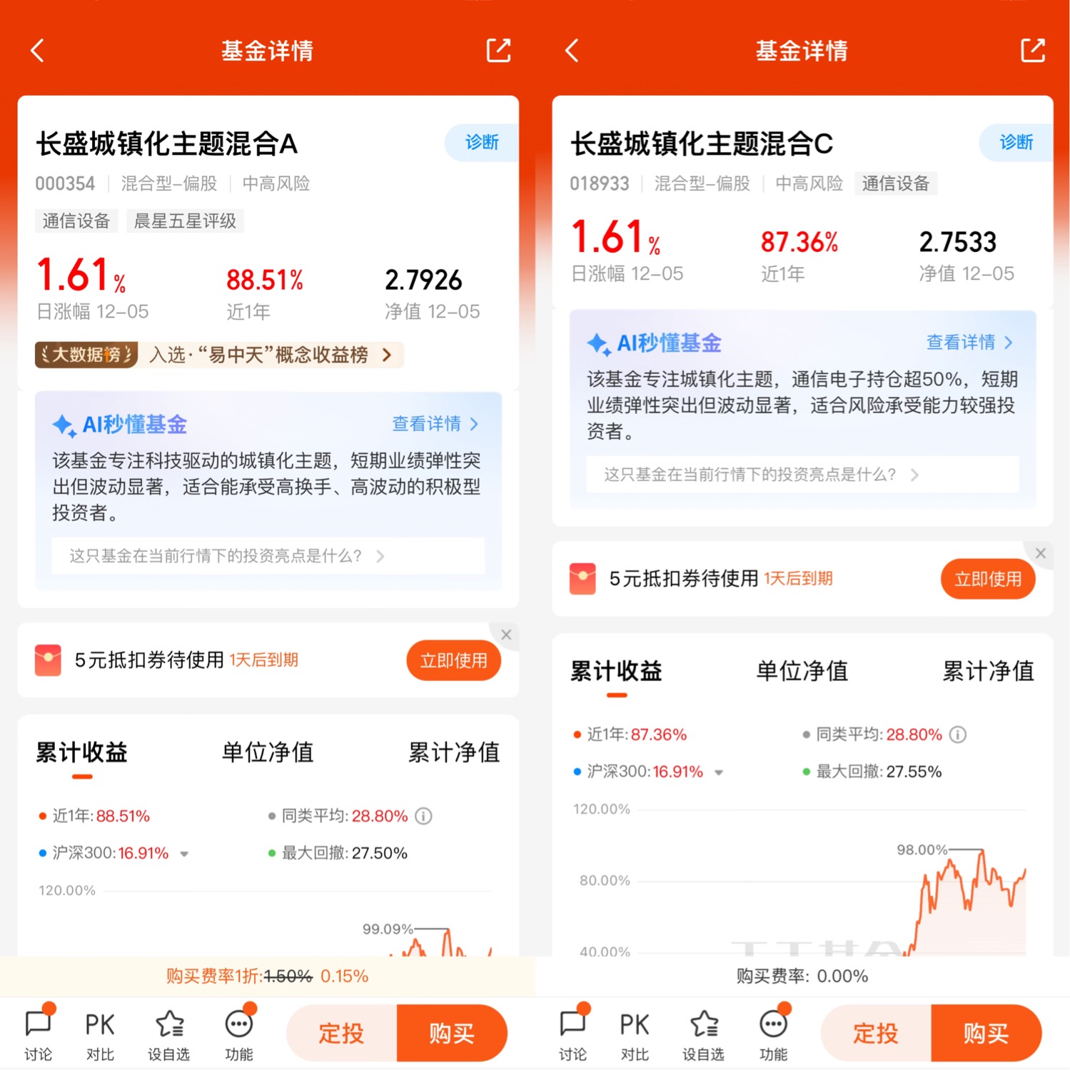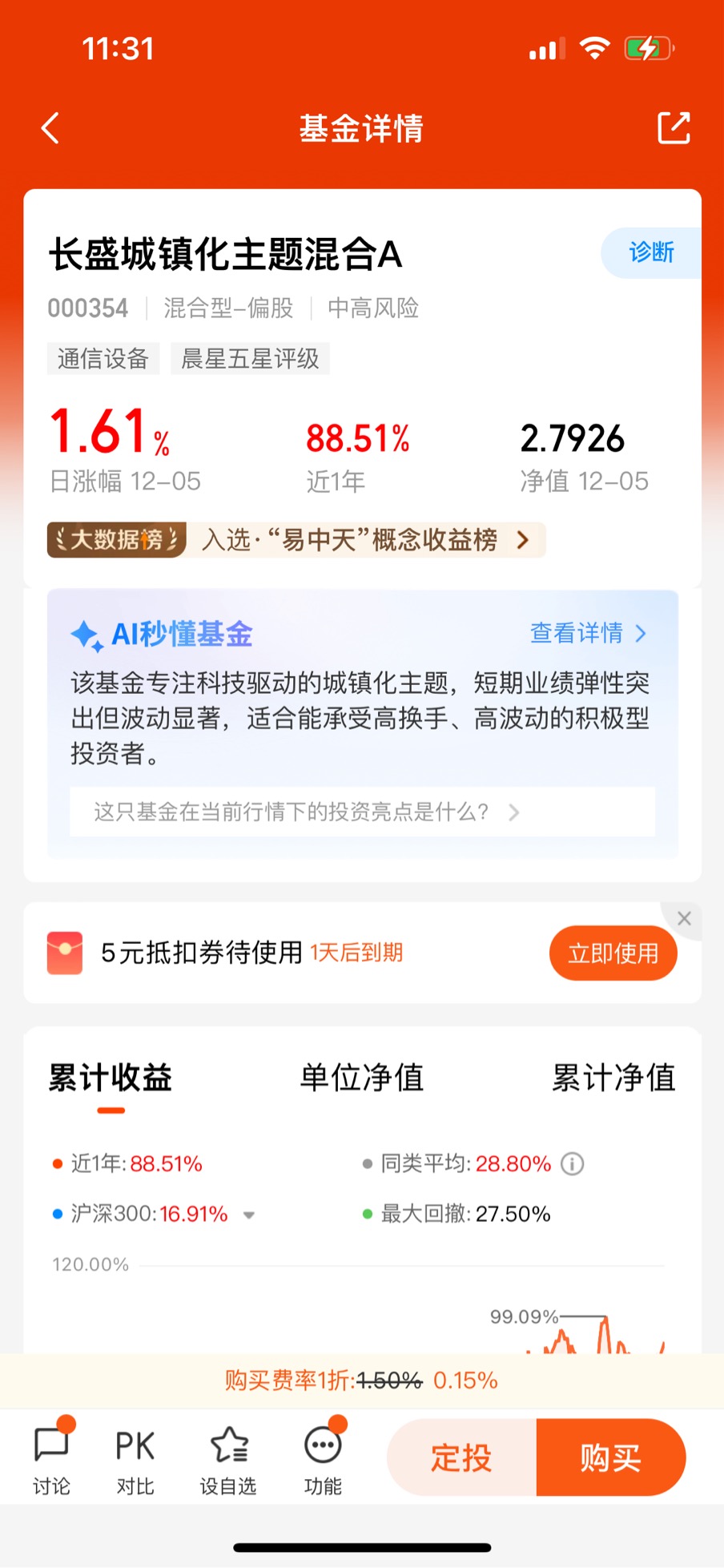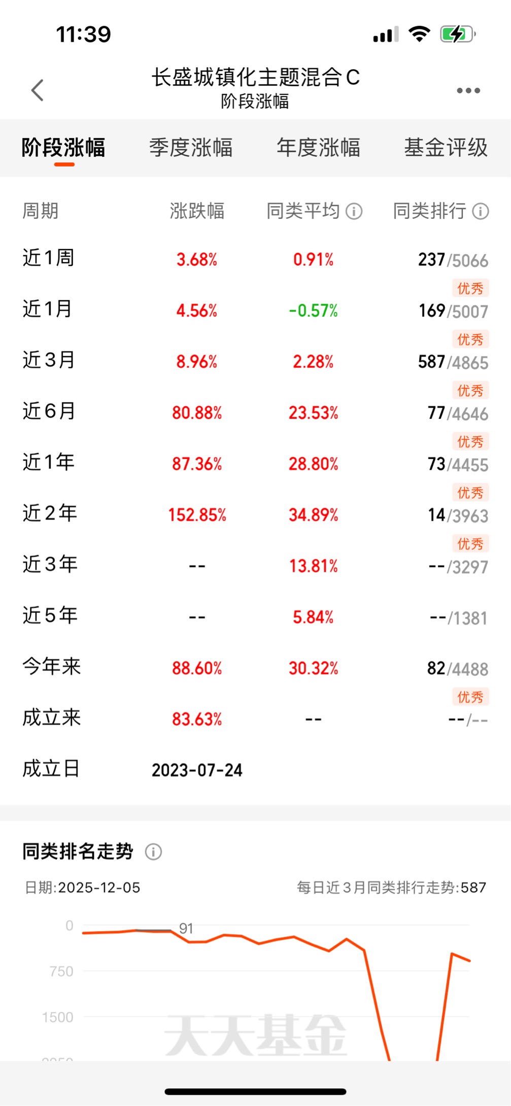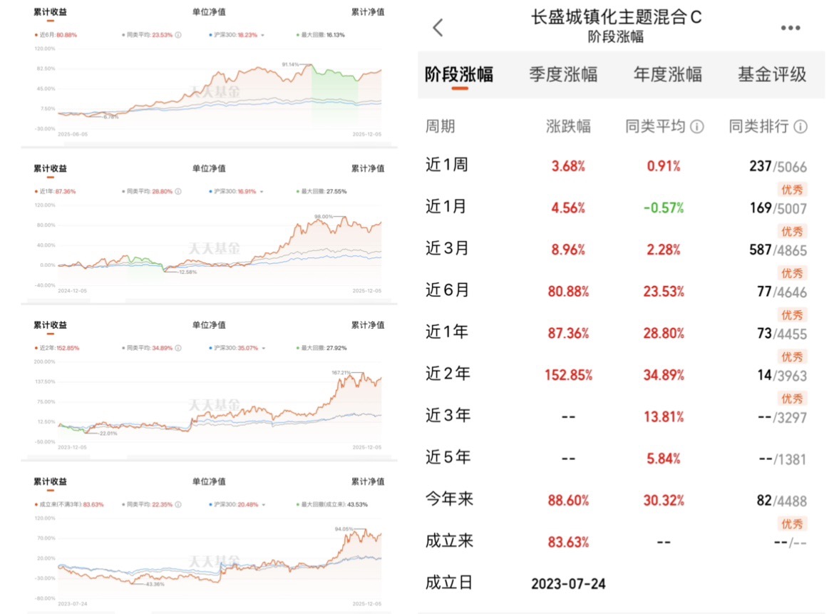 先拿最直观的业绩说话吧,这基金近一年涨了87.36%,今年以来更是干到88.6%,同期沪深300才涨18.91%,同类平均也就28.8%。你可能会说“涨得多的基金多了”,但关键是它涨得“稳”。我翻了下它的净值曲线,去年四季度科技板块回调的时候,它最大回撤也就27.55%,比很多纯科技基金动辄40%的回撤温和太多。就拿今年6月那波AI行情调整来说,我手里另一只光模块主题基金跌了快30%,这只就跌了12%左右,反弹的时候却比那只快。上周科技板块又抖了一下,它近一周还涨了3.68%,同类平均才0.91%。这种“涨得多、跌得少”的体质,对咱们普通投资者太友好了,不用天天盯着盘心惊肉跳,拿得住才能吃到收益。