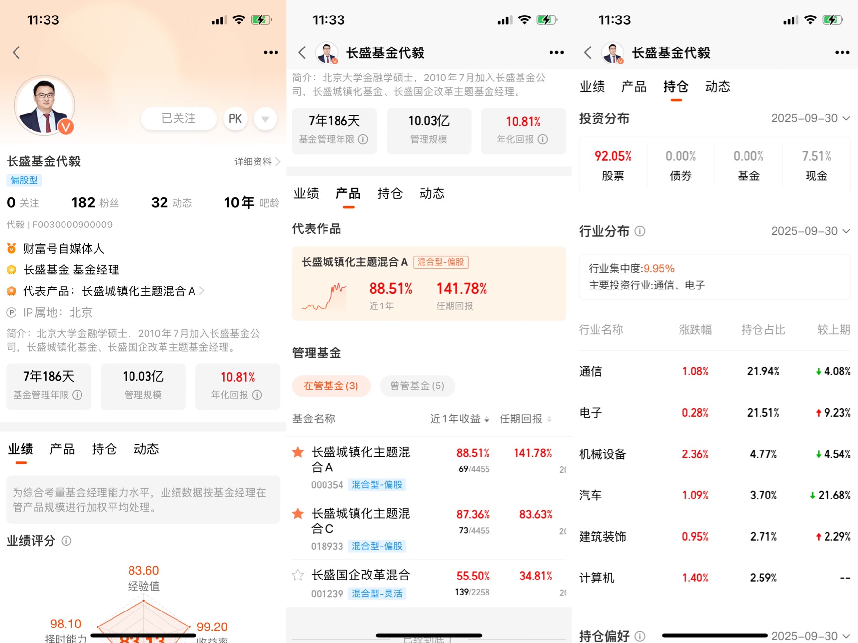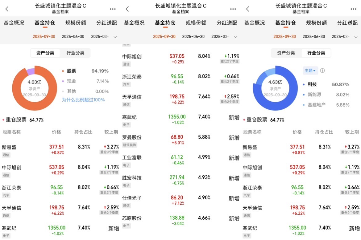一开始我也被“城镇化”这名字骗了,以为是买水泥、地产的,点开持仓才发现,这哪是城镇化啊,分明是科技基金的“马甲”!最新持仓里,通信(28.89%)+电子(21.98%)占了快50%,剩下的也是汽车、机械设备里的科技细分。你看它前十大重仓,中际旭创、天孚通信是光模块龙头,寒武纪是AI芯片,新易盛是通信设备,全是当下最火的硬科技赛道。这基金经理太鸡贼了,借着“城镇化”的壳,把钱全砸进了科技成长,毕竟现在“新型城镇化”本身就和AI、算力、智能硬件绑在一起,既踩中了政策风口,又拿到了科技的高成长,两头占着便宜。