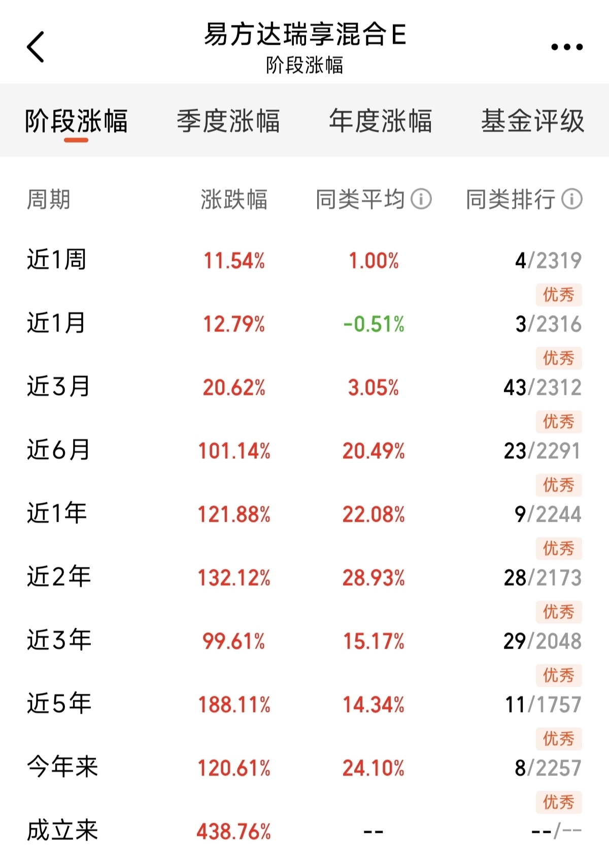 今天的科技CPO又厉害了,早盘低开后迅速拉升。带领市场今天继续回暖!目前来看,市场想要突破。还得是看科技的表现。$易方达瑞享混合E$ 这支主动的科技混合基金。长期聚焦科技成长赛道。主要持仓CPO,光模块等方向。在本轮行情中的表现一直不错,昨天上涨了7.46%。近一年涨幅121.88%。成立来涨幅超400%。基金经理,深耕科技多年。把握行情的眼光。一直在不断创新高。而且遇到波动回撤控制的也是比较稳,我看好四季度继续创新高。
