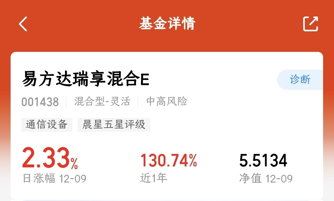 今天股市震荡,不过探底回升,CPO赛道也是继续强势,$易方达瑞享混合E$ 近期表现优异,昨日单日净值涨幅达2.33%。该产品成立以来累计收益超400%,依托基金经理前瞻性布局与坚定调仓能力,十年间持续把握成长赛道机遇。其全市场配置策略在轮动行情中展现强劲爆发力,业绩持续领先同类产品。
