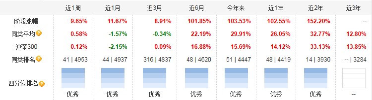 从2023年7月24日成立以来,截至目前收益达到98.17%。近1一周收益9.65%;近1月收益11.67%;近3月收益8.91%;近6月收益101.85%;近1年收益102.55%;近2年收益152.2%;今年来收益103.53%,表现还是相当不错的。