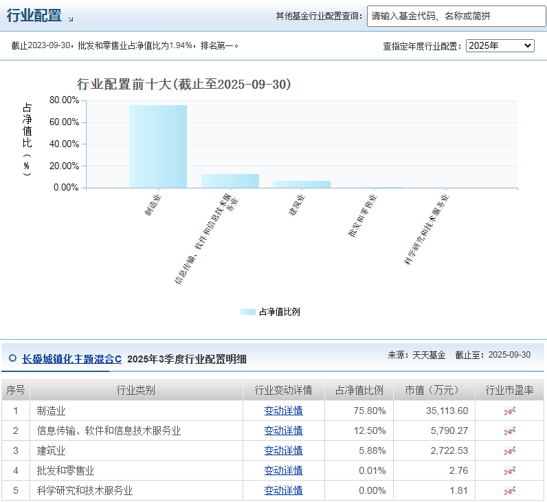 从2025年9月30日的资产配置报告来看,股票占净比94.19%,制造业占基金净值比75.80%,信息传输、软件和信息技术服务业占比12.50% 。如果这些行业未来发展好,对基金收益是有积极作用的,但要是行业不景气,基金也会受影响。