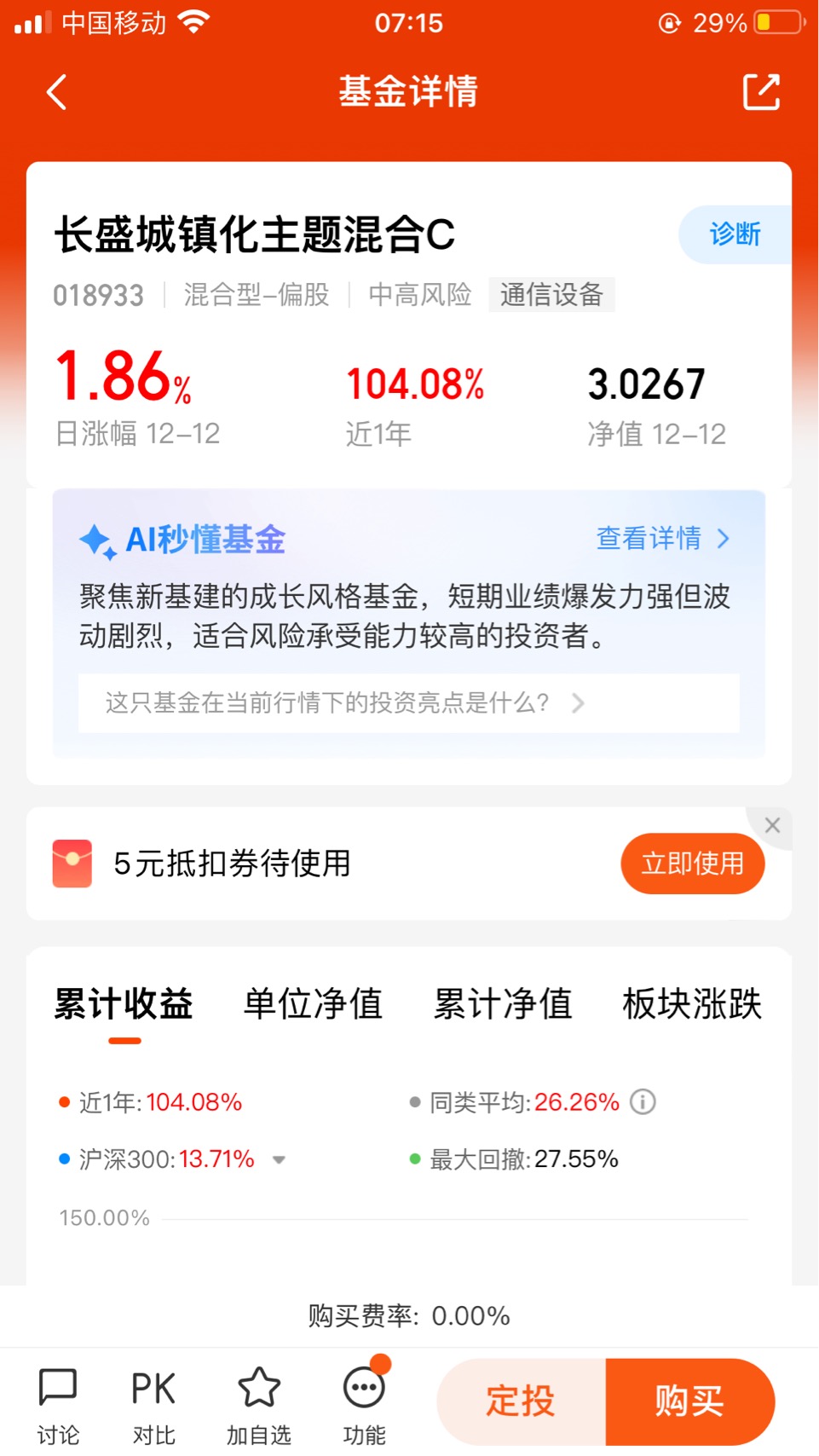在$长盛城镇化主题混合C$#我是长期看好科技的。科学技术是第一生产力。未来大国间的竞争,就是科技的竞争。长期看好长盛城镇化主题混合,但是短期起伏太大,所以我也是采取定投。涨也开心,跌也开心。年末资金做好配置。对于看好的基,做小额定投。希望大家都赚钱,期待我中奖。
