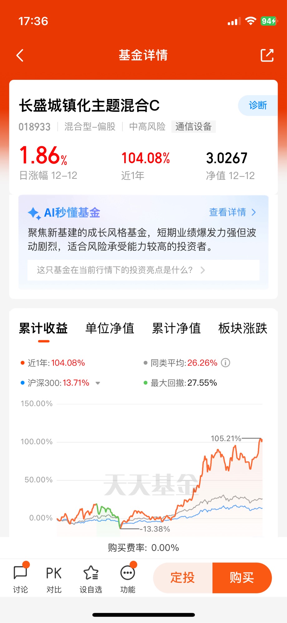 这一点长盛城镇化主题混合表现不错。该基金近一年回报达到104%,相较基准的超额超过了90%。
