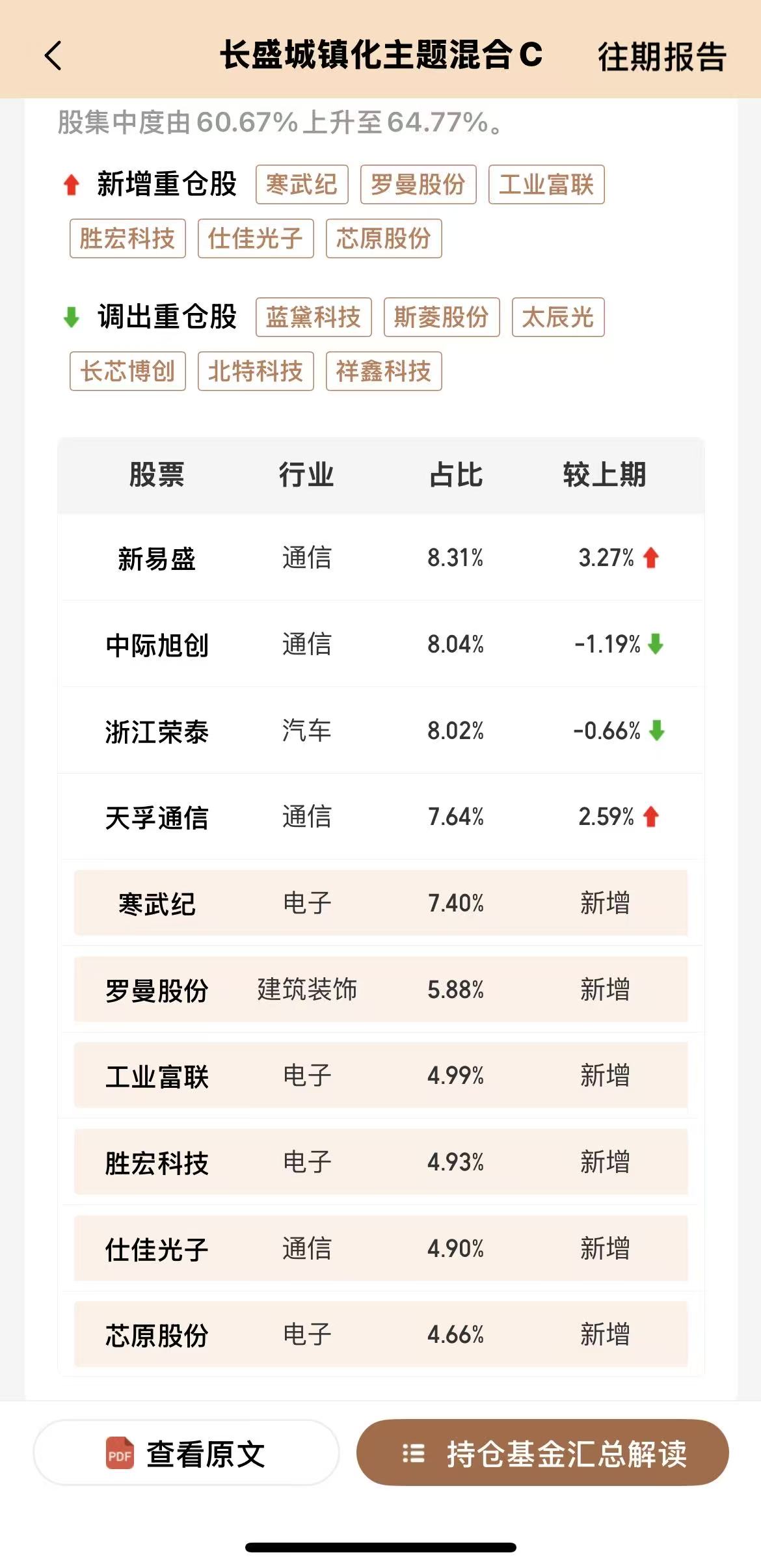 3季度持仓占比主要是通信,新增寒武纪、罗曼股份、工业富联、胜宏科技、芯原股份等,并调出蓝黛科技、太辰光、北特科技、长芯博创等,其中新易盛连续重仓9个季度,占比较上期上升3.27%,而中际旭创和浙江荣泰相对下降,天孚通信占比也上升2.59%,