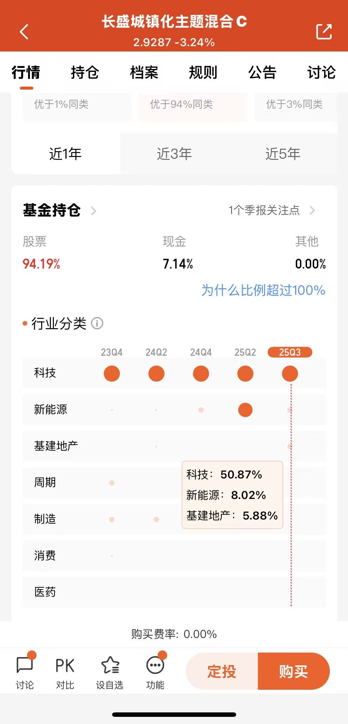 能取得如此优秀的成绩,自然也和当前牛市持仓比例有关,截至3季度,股票持仓高达94.19%,现金7.14%,行业分类主要在科技、新能源和基建地产板块中,