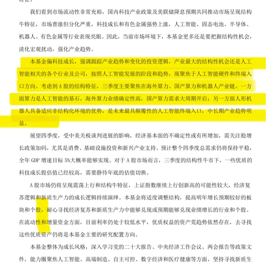 翻看这只基金最新的公开报告,它的投资策略清晰而进取。比如,根据其2025年三季度报告,它明确表示:“产业最大的结构性机会还是 AI 相关的各个行业及公司”,并“坚持集中在人工智能硬件方面的配置”,主要聚焦在“算力产业链和机器人产业链”。 这正切中了AI发展的核心命脉——算力是基石,机器人是未来最具潜力的终端入口。 具体到持仓上,其股票资产占比一直保持较高水平,显示出积极追求成长性收益的决心。