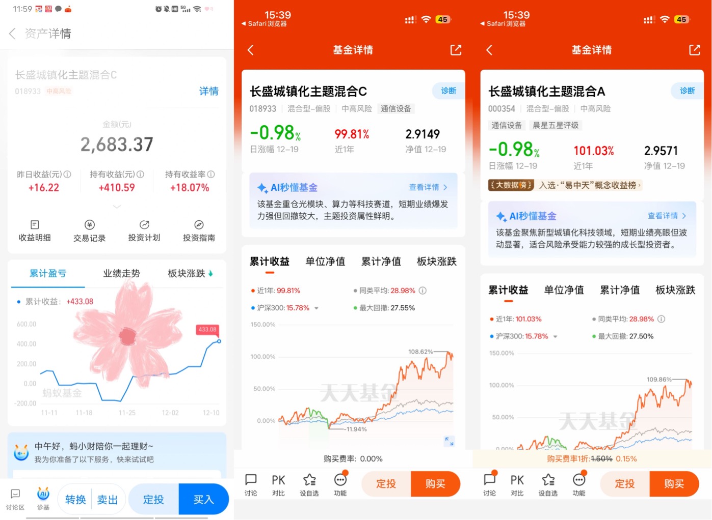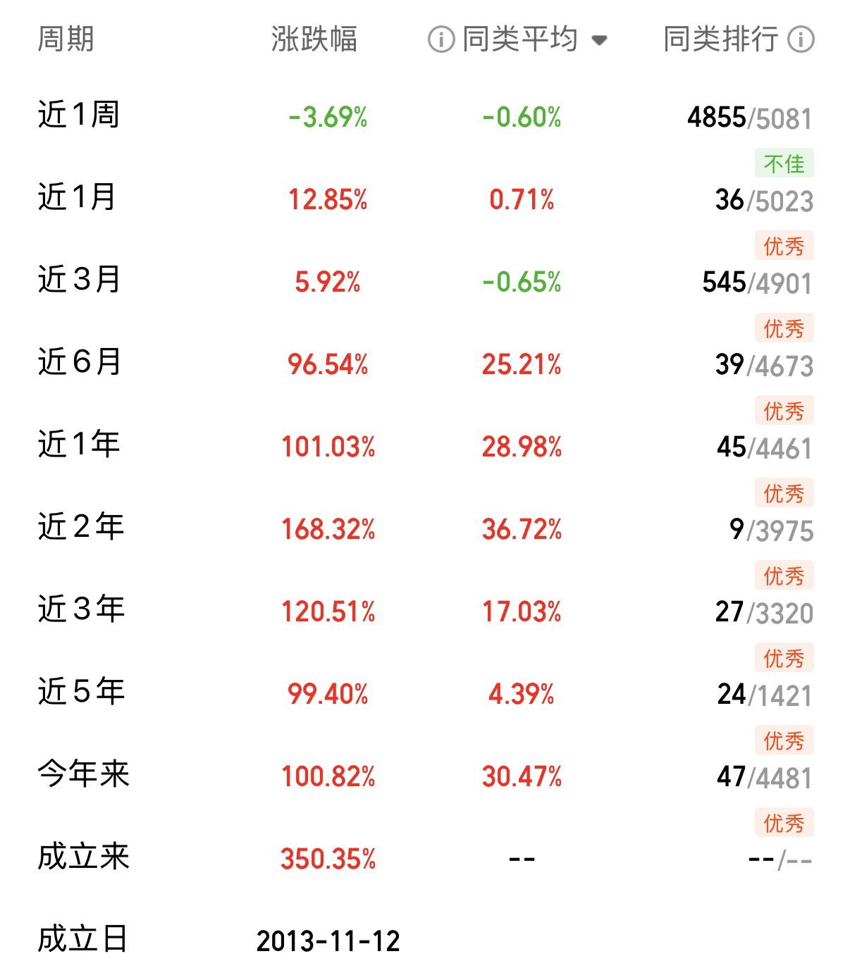 而且,他并非简单的“成长股选手”,其投资框架融合了对“周期律动”的深刻理解与对“成长进攻”的敏锐把握,这让他能在复杂的科技产业变迁中游刃有余。正如他自己所言:“对周期的把握有利于对科技成长趋势的判断。” 这种能力,在他管理的基金业绩上得到了淋漓尽致的体现:截至2025年9月30日,该基金A份额(000354)今年以来收益率高达85.27%,大幅跑赢同类;而最新的数据显示,截至2025年12月19日,其今年以来收益率已突破100%,达到惊人的100.82%,在同类基金中排名前2%;其近一年、近两年、近三年的累计回报同样耀眼,分别达到101.03%、168.32%和120.51%,排名均位列同类前1%。 自他2018年6月5日接管该基金以来,7年半时间累积收益达156.03%,年化回报超10%,这份穿越周期的长期成绩单,是对他能力最有力的背书。