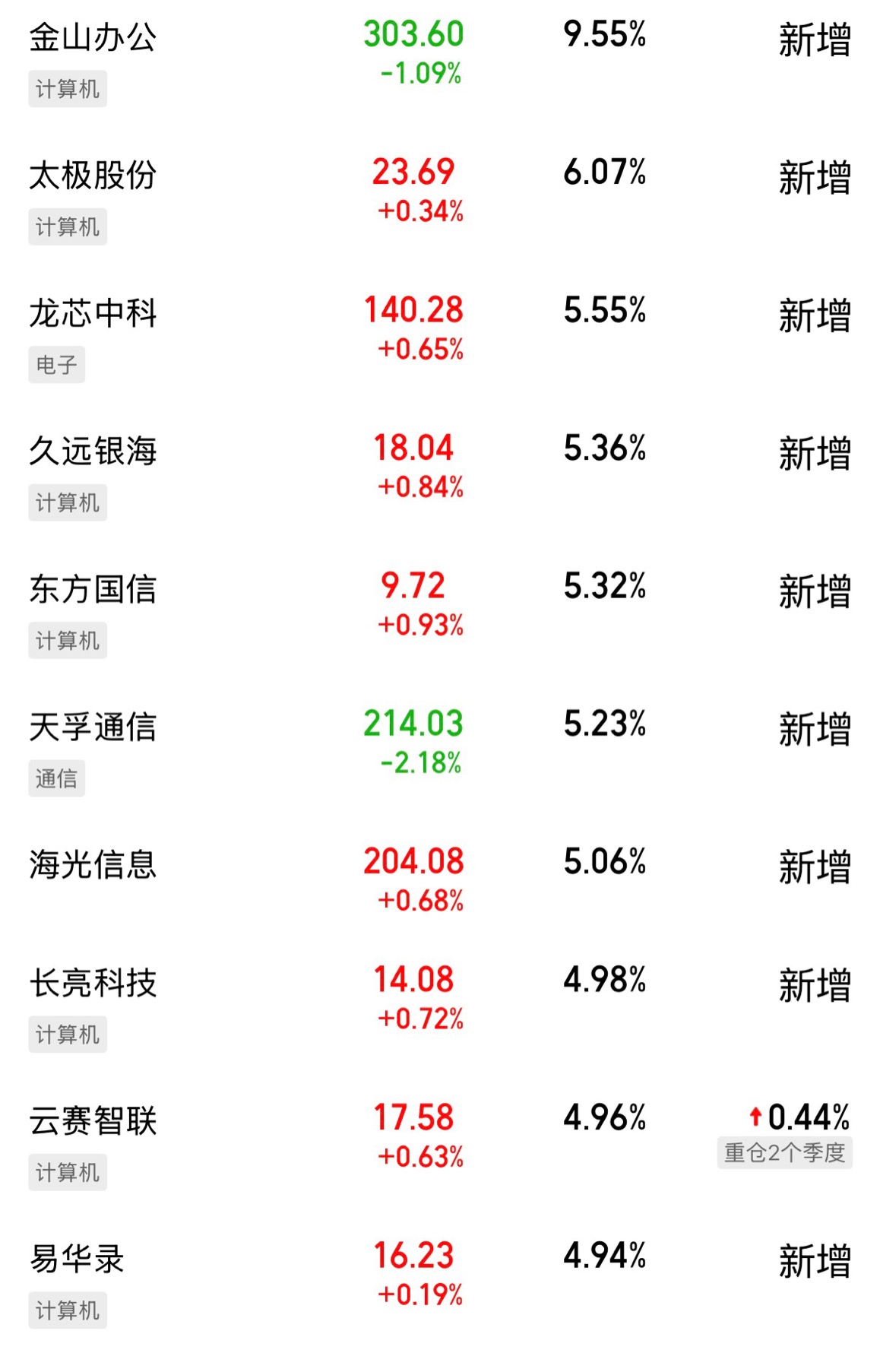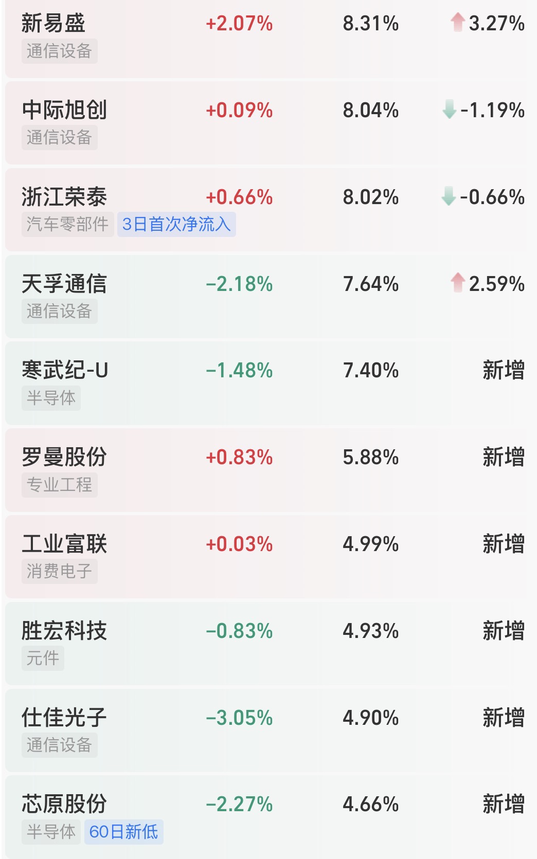 进一步深入其持仓组合,你会发现它深度布局了像寒武纪、芯原股份这样的国产半导体龙头,它们正全力参与国产芯片产业链的突围,这是构建强大AI算力网络不可或缺的硬件基础。同时,它还敏锐捕捉到AI发展带动的光通信需求,重仓了新易盛、胜宏科技、佳仕光子等光模块企业。 此外,像工业富联(消费电子代工巨头,深度参与AI服务器制造)、浙江荣太(机器人领域)等标的,也出现在它的核心布局里。 这种组合非常巧妙:既能享受到半导体芯片、高速光通信这类高增长、高弹性赛道的爆发力,又能依靠这些基本面相对扎实、业务与AI强相关的硬件公司来平衡风险,对冲波动。对我这样风险承受能力中等、既想分享科技红利又不想承受过大波动的投资者来说,这种配置思路显得格外有吸引力。