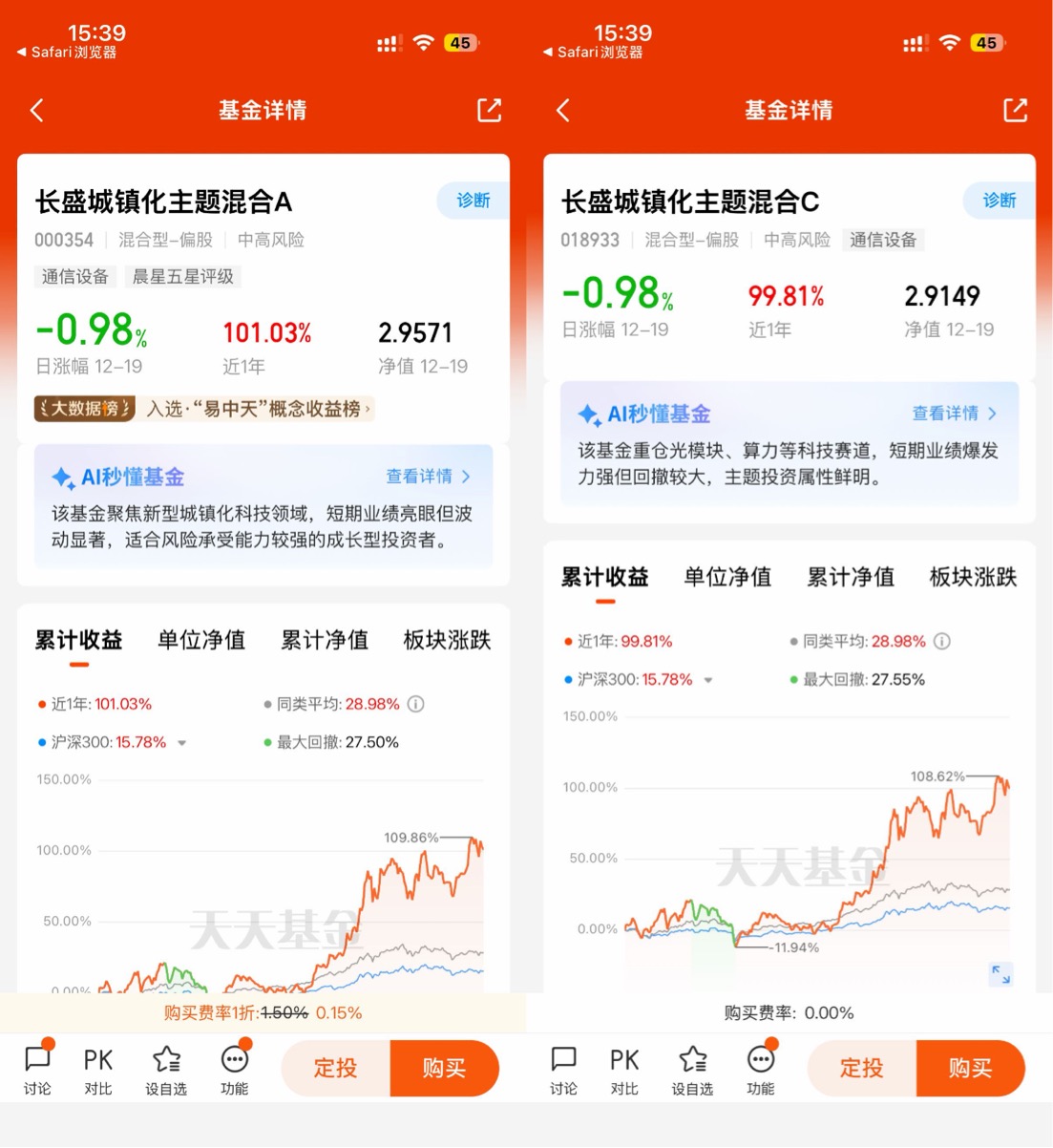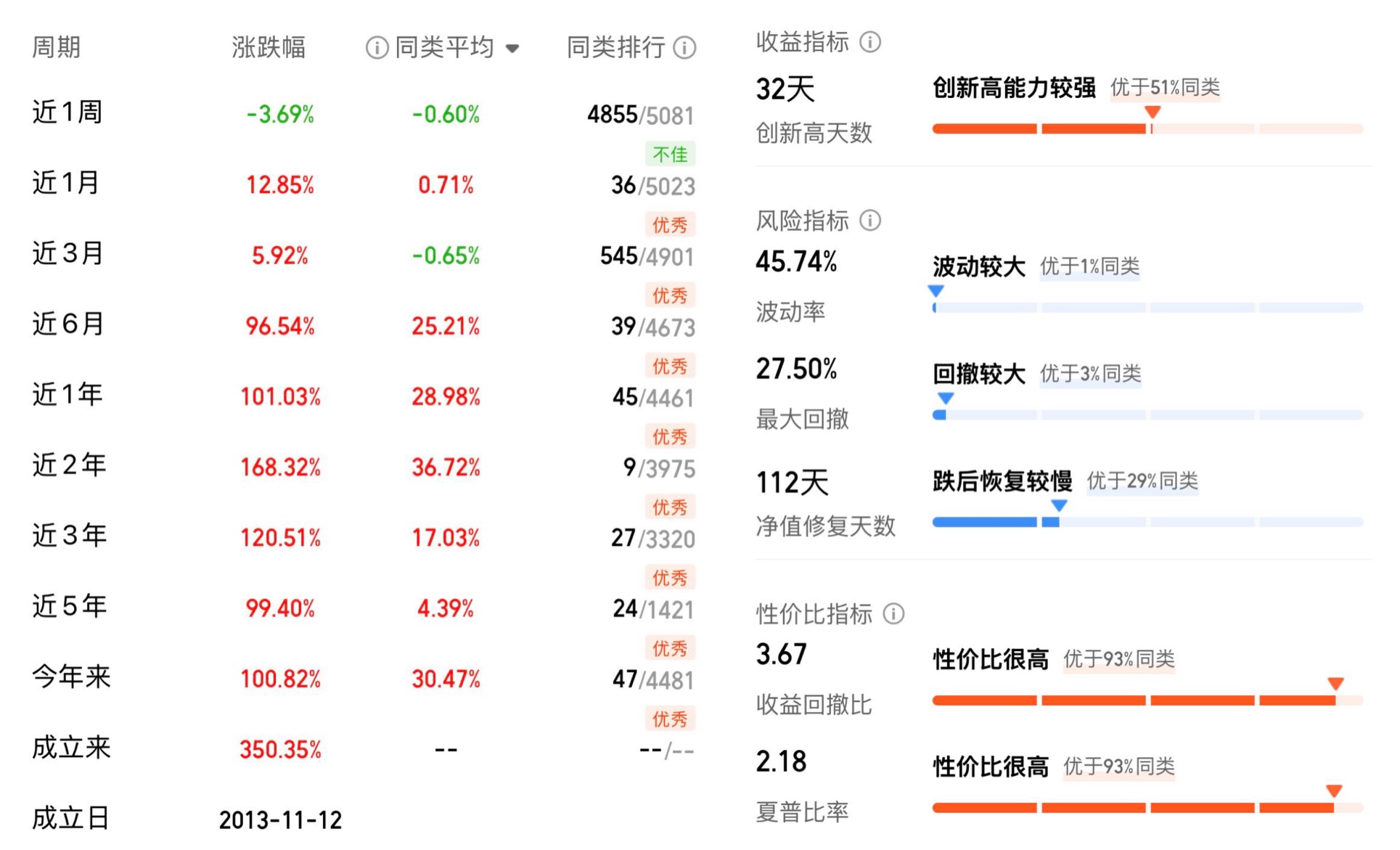 有了这样前瞻性的管理思路,落实到实际业绩上,表现自然而然也非常亮眼。截止2025年12.19号,这基金的A类份额近一年涨了101.03%,而同期沪深300才涨15.78%,代表科技成长的创业板指数涨幅也仅仅只有41.05%,同类平均也就28.98%。看到这个业绩表现,有一些小伙伴可能会出现“恐高”的情况,在我看来大可不必,从这几年的基金净值曲线来看,它涨得可以说是特别稳!我们就以去年四季度科技板块大幅度回调时为例,它最大回撤也就27.50%,比很多同类型的科技基金动辄40%的回撤温和太多。这种“涨得多、跌得少”的体质,对咱们普通投资者太友好了,不用天天盯着盘心惊肉跳,拿得住才能吃到收益。