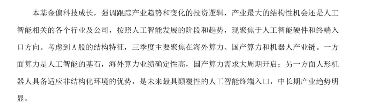 现任的代毅经理在长盛城镇化主题混合基金的2025年三季报里这样写道:“本基金偏科技成长,强调跟踪产业趋势和变化的投资逻辑,产业最大的结构性机会还是人工智能相关的各个行业及公司,按照人工智能发展的阶段和趋势,现聚焦于人工智能硬件和终端入口方向。考虑到A股的结构特征,三季度主要聚焦在海外算力、国产算力和机器人产业链。一方面,算力是人工智能的基石,海外算力业绩确定性高,国产算力需求大周期开启;另一方面,人形机器人具备适应非结构化环境的优势,是未来最具颠覆性的人工智能终端入口,中长期产业趋势明显;再者,结合A股市场当前的结构特点,聚焦于硬件和终端入口方向,更能把握确定性较高的投资机会,同时为未来应用端的爆发做好铺垫。”
