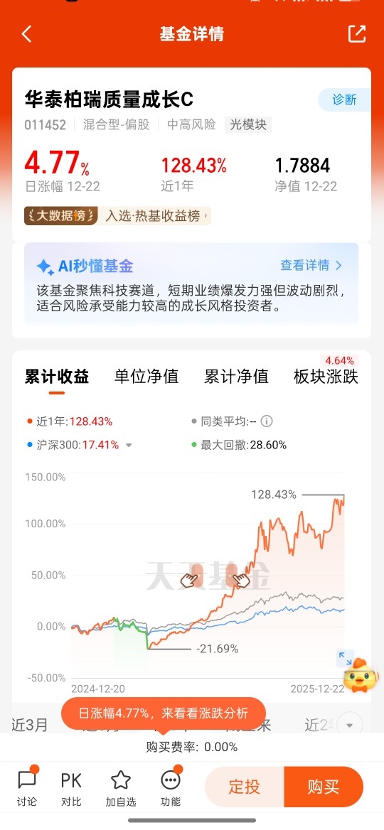 今天打开行情软件,CPO板块直接霸屏涨幅榜!从龙头到细分领域个股,全线飘红,有的甚至逼近涨停,市场对这个赛道的认可程度不言而喻。随着AI应用越来越广,算力需求只会越来越大,CPO作为关键技术,景气度还会持续往上走。不想错过这波行情但又怕踩雷个股?华.泰.柏.瑞的相关产品了解一下,它以“成长、质量、估值”为核心选标的,既聚焦高成长赛道,又严控风险,近期净值跟着CPO板块大涨,近一年表现十分突出。不用自己选股,就能跟着专业团队分享产业发展的红利,省心又靠谱。