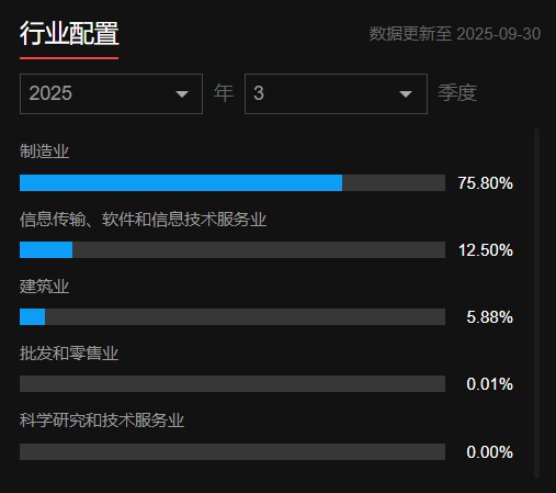 从行业分布数据可清晰看出,基金核心配置方向为制造业,占比高达75.80%.