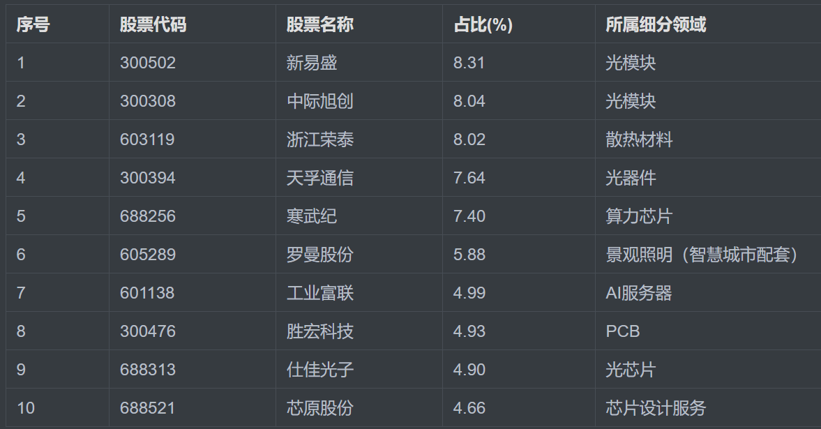 结合前十大重仓股明细可知,制造业配置主要集中于电子制造(光模块、光芯片、PCB等)、高端装备制造(AI服务器)等科技制造细分领域,这与基金聚焦AI硬件、算力赛道的投资策略完全匹配。其次为信息传输、软件和信息技术服务业,占比12.50%,