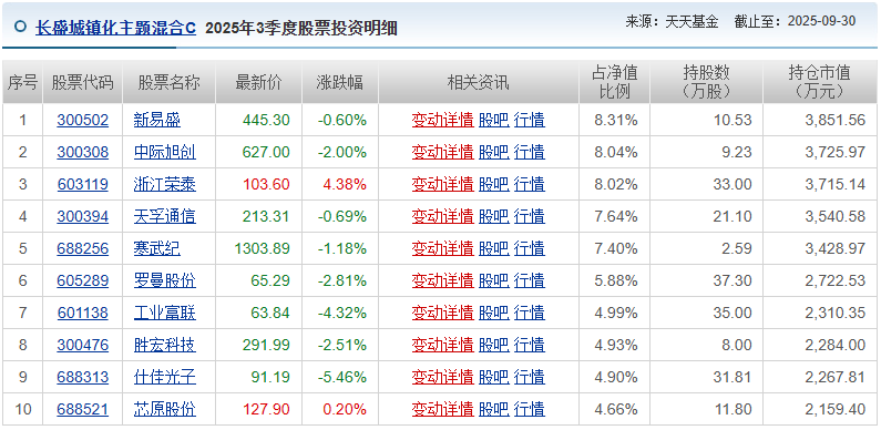 通过分散投资(前十大重仓股占比仅 58%)和严格的止损机制,基金近一年最大回撤仅 18%(同期同类基金平均 25%),兼顾收益与稳健。投资理念上,坚守 “技术落地型” 标的,规避纯概念炒作,如重仓的天孚通信(光器件全球市占率超 15%)、寒武纪(云端 AI 芯片市占率国内前三)均为细分领域龙头,具备持续盈利和研发投入能力。