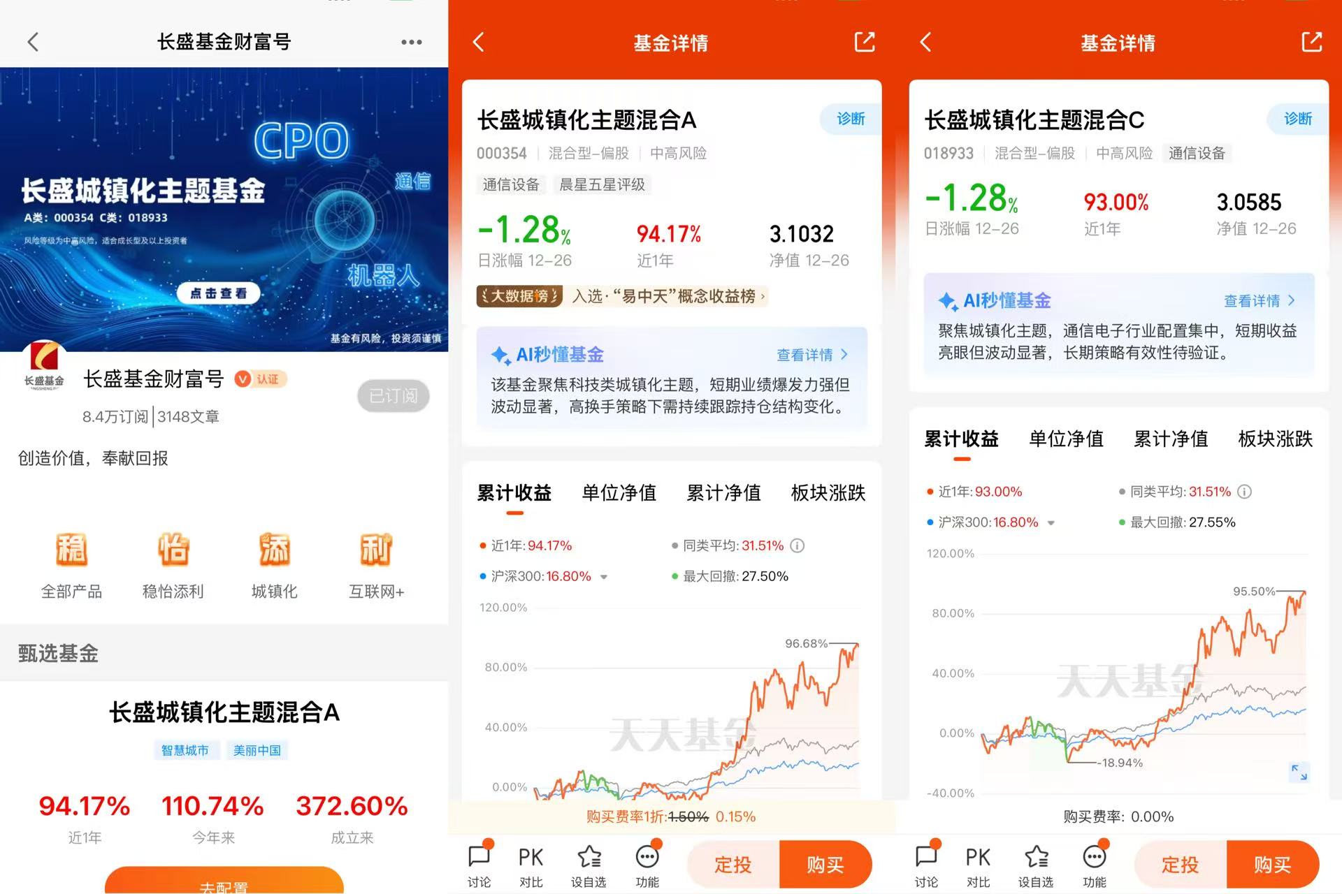 基金成立以来累计收益 89.51%(截至 2025 年 12 月),2025 年涨幅 73.86%,远超同期沪深 300 指数(+12.5%)。其独特之处在于聚焦城镇化进程中的科技应用场景,重仓 CPO 龙头(中际旭创、新易盛合计持仓超 16%)、AI 芯片(寒武纪持仓 7.4%)、智能汽车(工业富联、胜宏科技等),既享受科技成长红利,又受益于城镇化带来的基础设施智能化改造需求(预计 2026 年智慧城市投资超 5000 亿元)。