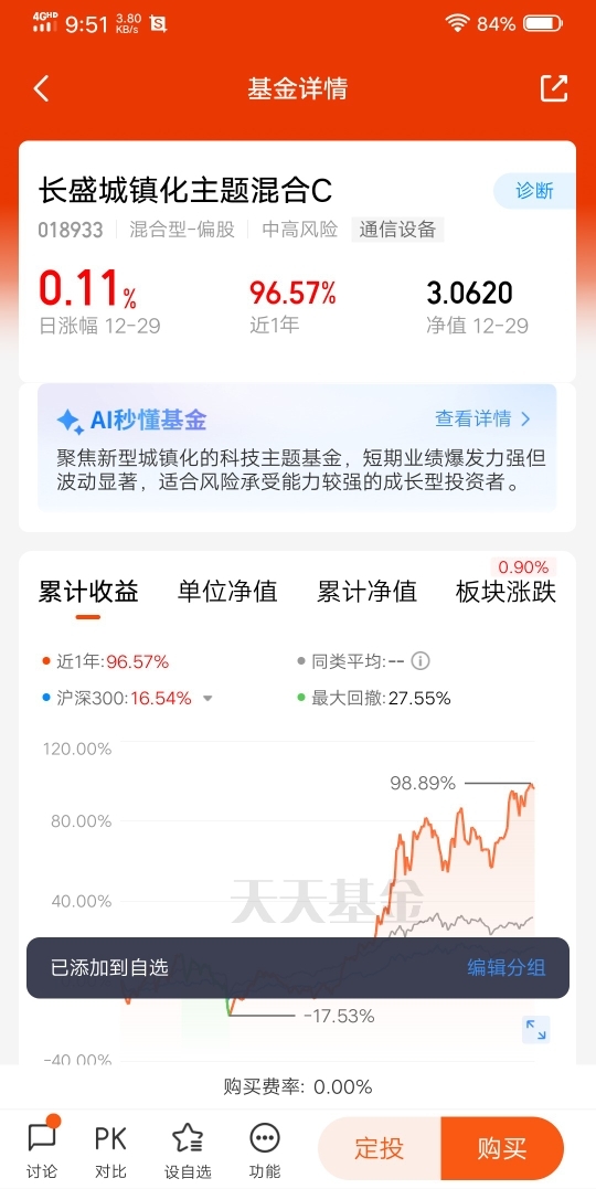 对于年末配置,我认为在结构性牛市背景下,优质科技成长股的估值切换值得期待。长盛城镇化在四季度策略中提到的稳增长政策加码、新兴产业支持等机遇,进一步增强了我对基金未来表现的信心。建议逢低加仓,长期陪伴基金把握科技产业的投资机会。