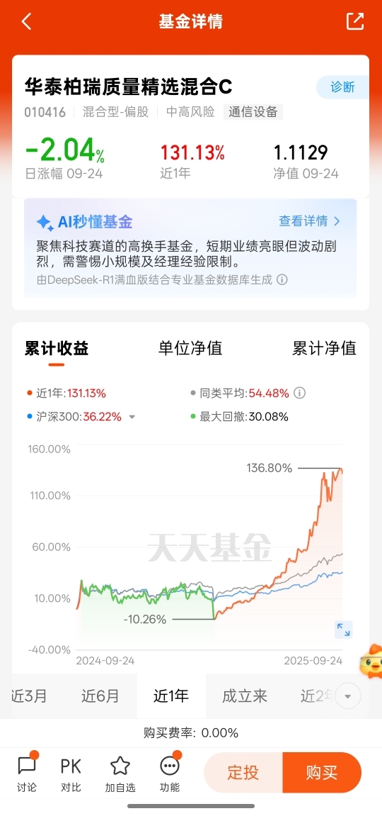 今儿通信板块的表现挺亮眼,虽然整体市场有点震荡,但它靠着光模块、5G设备这些权重板块撑住了场面,最终涨了1个多点。这波行情可不是虚的,一方面是全球AI算力基建进入爆发期,光模块等硬件需求暴增;另一方面通信板块估值才20倍左右,比其他科技板块便宜不少,性价比很高 。可很多人纠结不敢动,怕技术更新快,买的公司跟不上节奏。其实选华泰柏瑞就不用慌,它的“质量精选”策略就是找那些能跟上技术迭代、盈利稳定的公司,近期跟住了板块的上涨节奏,作为混合基金还能适当分散风险,场外购买门槛低,想布局通信的新手可以看看。