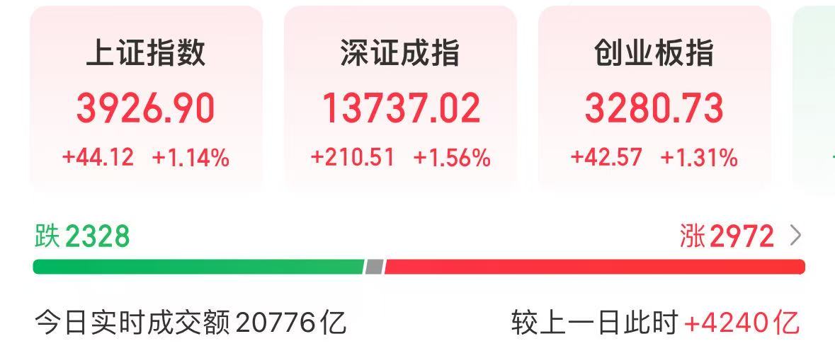 盘面上,截至我发文,上证指数上涨1.14%,深成指数上涨1.56%,创业板指数上涨1.31%