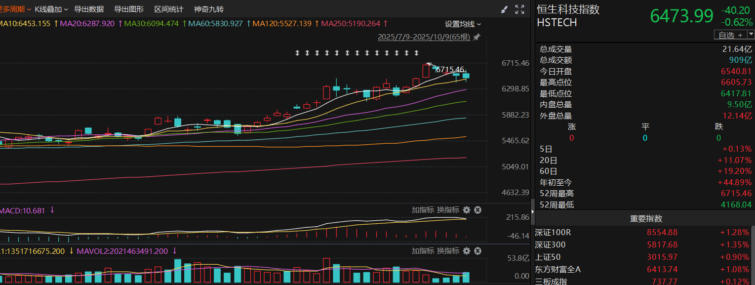 今天下跌走势,连续4天回调,基本上把节假日第一天的涨幅抹平,最近恒科我主要关注外资的流入情况,小摩、木头姐都在加速布局港股互联网,接下来10月美联储可能继续降息,外资也会加速回流