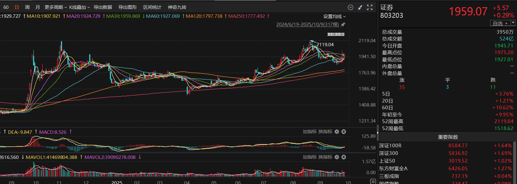 今天证券微涨走势,收小阳线,接下来10月进入3季度财报季,证券行业业绩确定性相对较高,前三季度160万亿的成交额,给证券公司带来比较好的佣金收入。