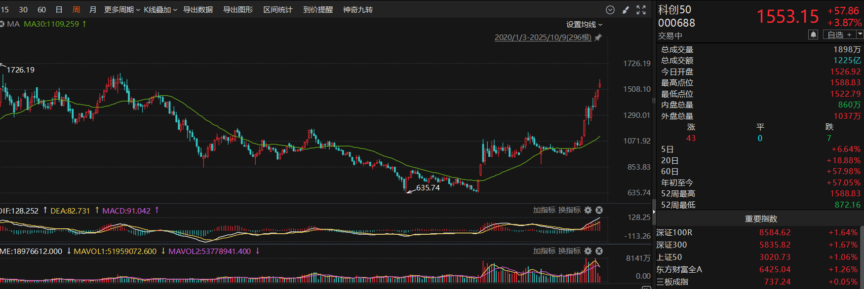 从技术面来看,科创板已经进入了中期的上行趋势,在周K线上,已经形成了一浪走势,我认为这可能是个开头,MACD红柱子还在放大,多头还在发力