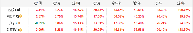 这只基金短中长期业绩优异,今年来收益率43.66%,近3个月收益率16.53%,近1个月收益率8.23%,尤其是近3个月、近1个月的表现位于16/62、9/62,位于同类的黄金基金前列