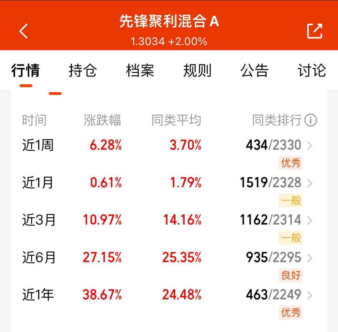 大盘分化那么明显,先锋聚利混合A却一路向上,昨晚2.00%近六个月27.15%近一年38%多,跟着政策走果然有肉吃。