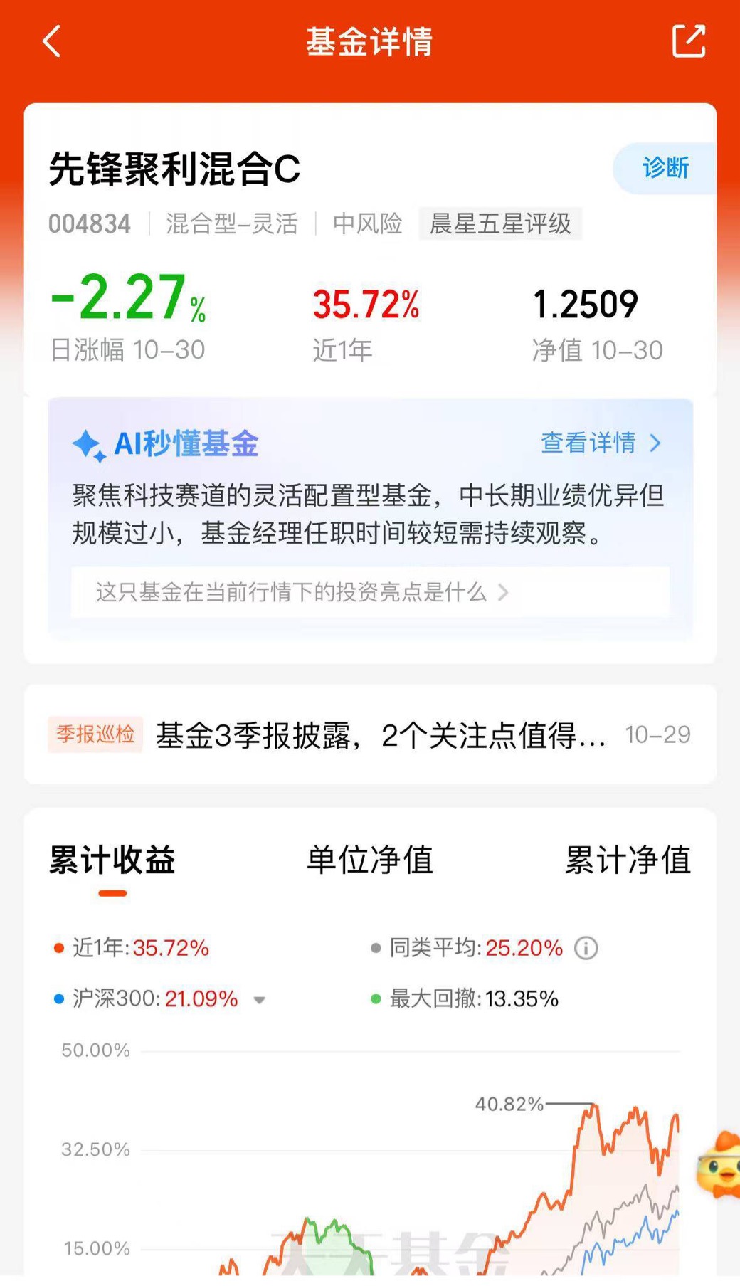 先锋聚利混合C今天回调,正好上车,近1年稳稳收35.72%,近三个月9.31%的收益确实亮眼,科技风口抓得准