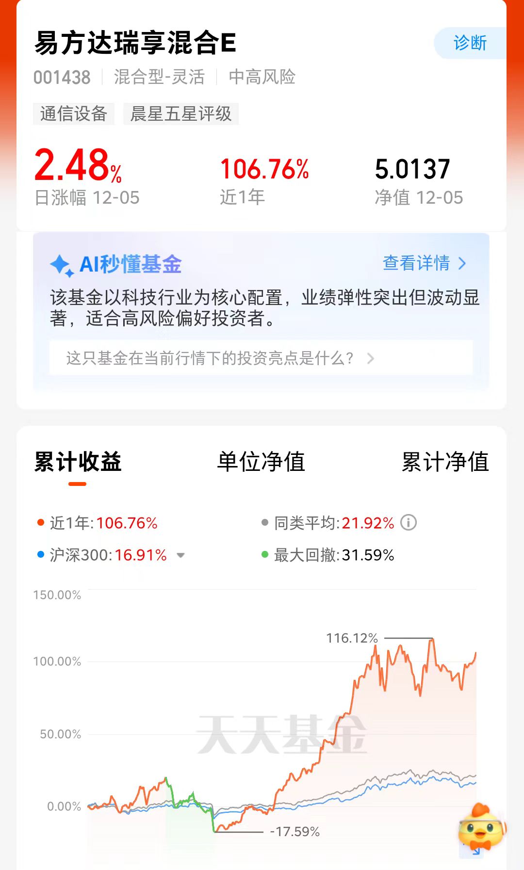 随着人工智能,大数据和云服务的蓬勃发展,算力产业链市场规模预计在2025年将突破万亿美元大关,而且随着AI应用的爆发,各国普遍重视算力基建,堪称“军备竞赛”,易方达瑞享混合E,爆发能力强,近一年上涨106.76%,跑赢同类。
