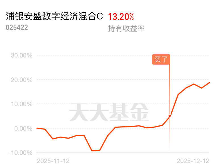 A股涨的猛还是得看CPO,而且得选主动基,浦银安盛数字经济这个CPO新晋黑马,今天继续涨!决定定投了,涨的心慌,近一周涨了十几个点了,年底补涨就靠你了!历史业绩看这个基应该持仓主要是CPO ,从上车开始都很优秀,前面的大涨还有今天的回撤控制已经证明基金经理的能力了,下面就看能不能拿住了,不到40%不下车$浦银安盛数字经济混合C$