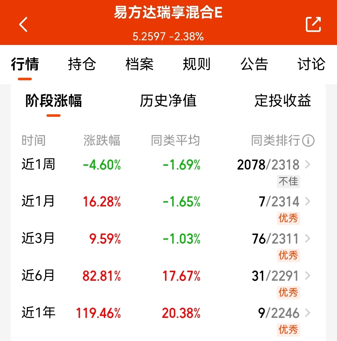 目前这种风险已经反应完毕,今天科技板块带头反弹,我觉得调整已经结束,这支$易方达瑞享混合E$ 持仓也是CPO为主,近半年也涨了82.81%,近期更是连续跑赢其他科技板块,对资金有明显的虹吸效应,赚钱性价比还是不错的!