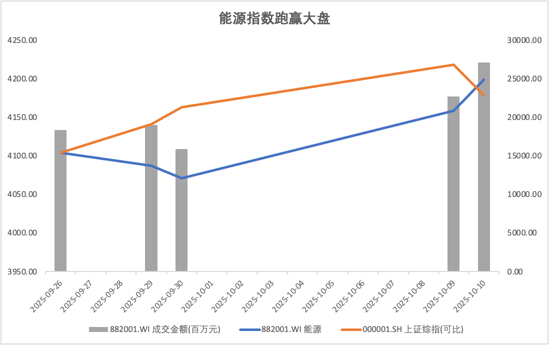 在统计的产业趋势里,「能源」是频率最高的方向,以能源指数(882001.WI)测算,9.26到10.10,区间涨幅2.29%,上证综指同期上涨1.80%,再次获得超额收益。