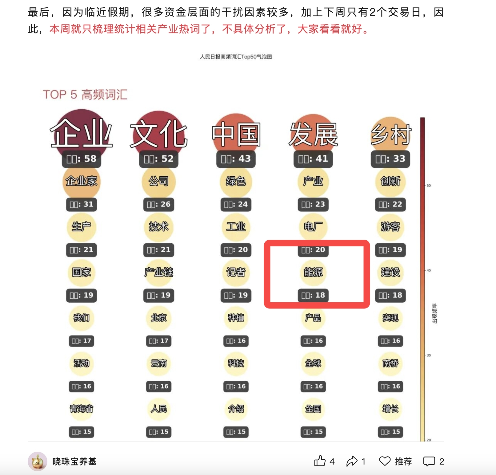 假期过后的这周同样如此,因为只有2个交易日,而假期里《人民日报》相对“减弱”了对经济的报道,很多趋势性的信息也许没有办法体现,所以,本周还是只梳理统计相关产业热词了,不具体分析了,大家可以自己判断。感兴趣的朋友可以到威信里「晓珠宝养基」看看~