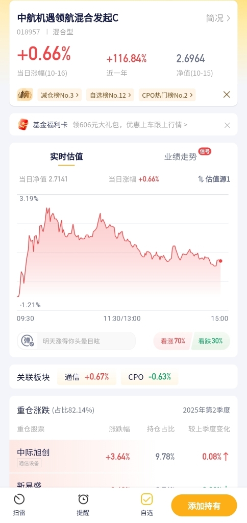 中航机遇领航混合发起C今天预估涨0.66%。这只基金今天小涨,可能是持仓的部分个股表现不错,带动基金上涨,希望能保持住这个势头。