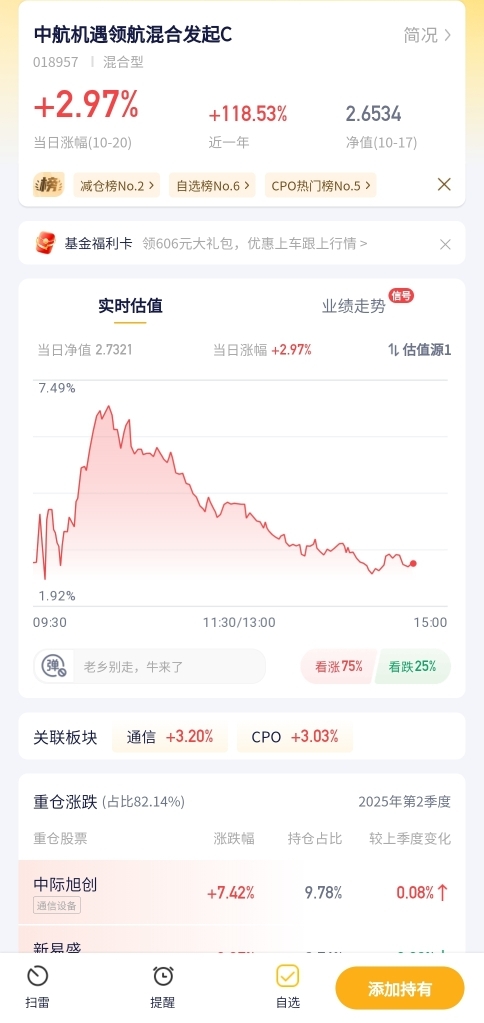 中航机遇领航混合发起C今日预估涨幅2.97%!