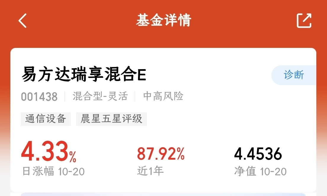 最近两天行情可以啊,昨天反弹,今天继续反弹,$易方达瑞享混合E$ 很是不错,昨日竟然上涨了4.33%,可真不少。