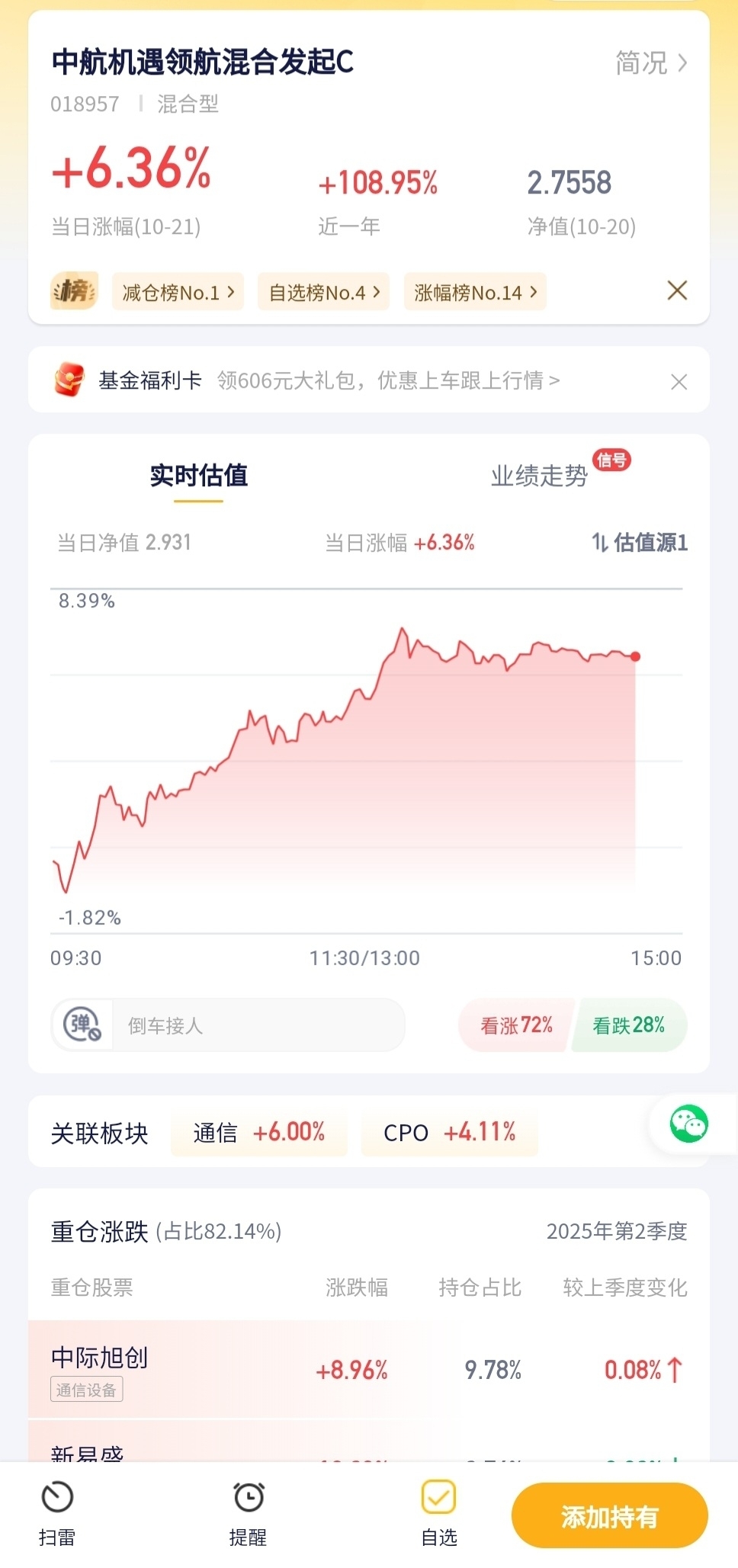 中航机遇领航混合发起C今日预估涨幅6.36%!