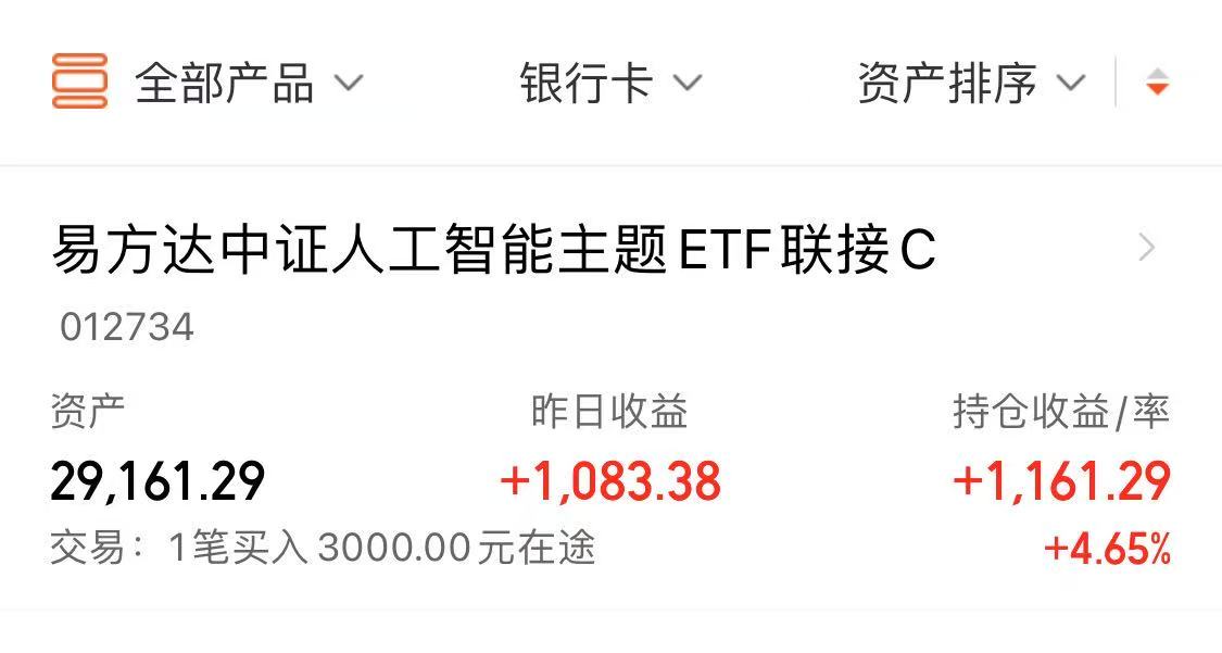 这个之前买过很多次了,无论是场内规模、场外热度还是业绩表现,都是第一档的,如果打算买人工智能,认准这个就行了。$易方达中证人工智能主题ETF联接C(OTCFUND|012734)$