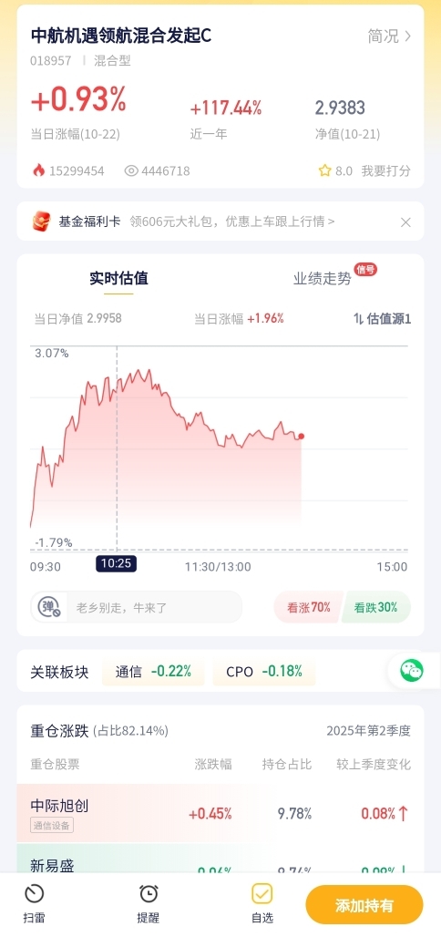 - 中航机遇领航混合发起C今日预估涨幅0.93%!