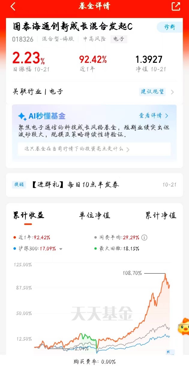 真被这只基的表现惊艳到了,昨天大涨2.23%+,今年收益92%回撤才18%,走得