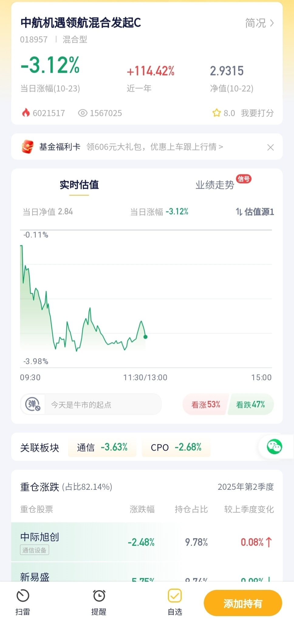 中航机遇领航混合发起C今日预估跌幅3.12%!