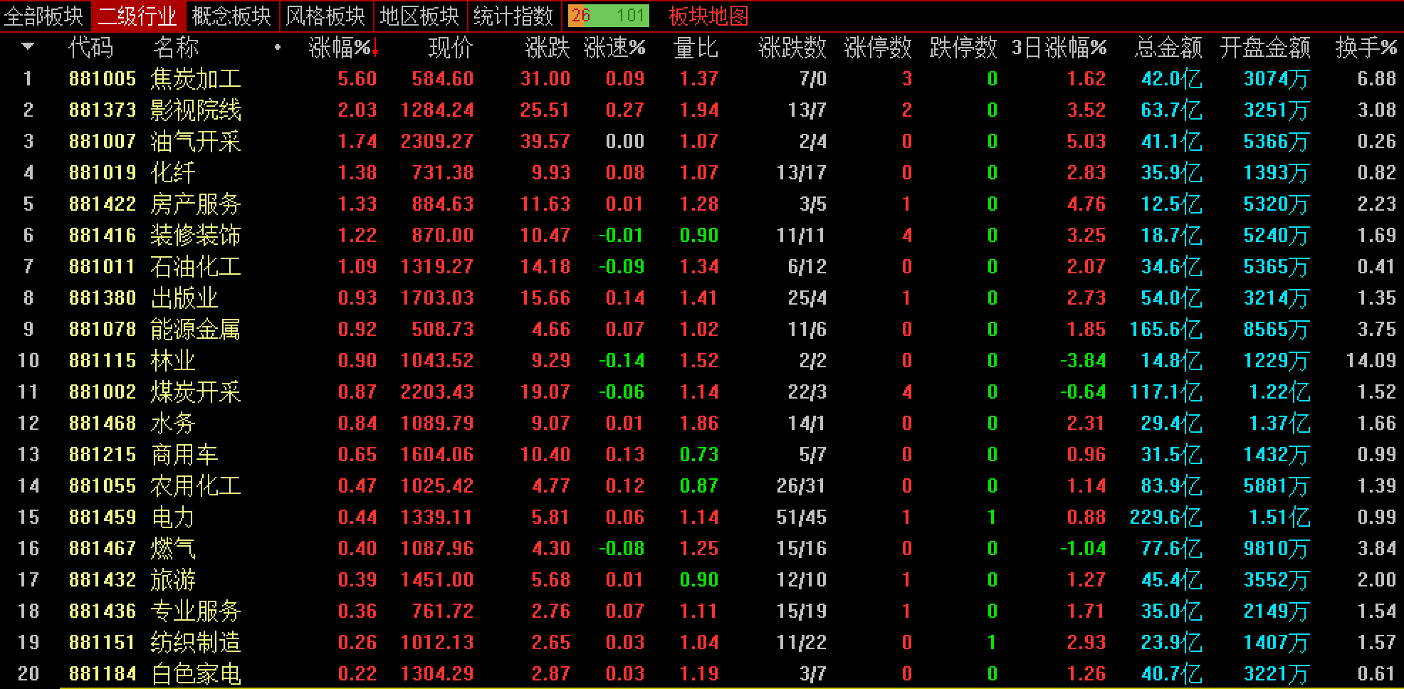 市场今天全线低开,沪指低开低走跌破了 3900 点,成交额跟昨天同期比基本持平。现在沪指已经没条件突破上涨,量能不够还会加大阴跌调整的风险。看日 K 线趋势,上午沪指在 5 日均线附近有支撑,但短期均线支撑力度不强,当下沪指真正重要的支撑是 20 日均线。现在我们看看板块趋势: