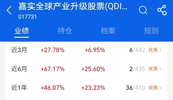 今天市场传来好消息,起稳回升啦!$嘉实全球产业升级股票发起式(QDII)C$ 表现出色得让人惊叹。近三个月涨了27.78%,近六个月涨幅超67%,排名相当靠前。该基金持仓均为全球优质公司,企业壁垒高,行业前景一片光明。投资回报率相当不错。现在正好处于低吸的黄金时机,机会难得,大家可别犹豫,赶紧抓住这波红利!