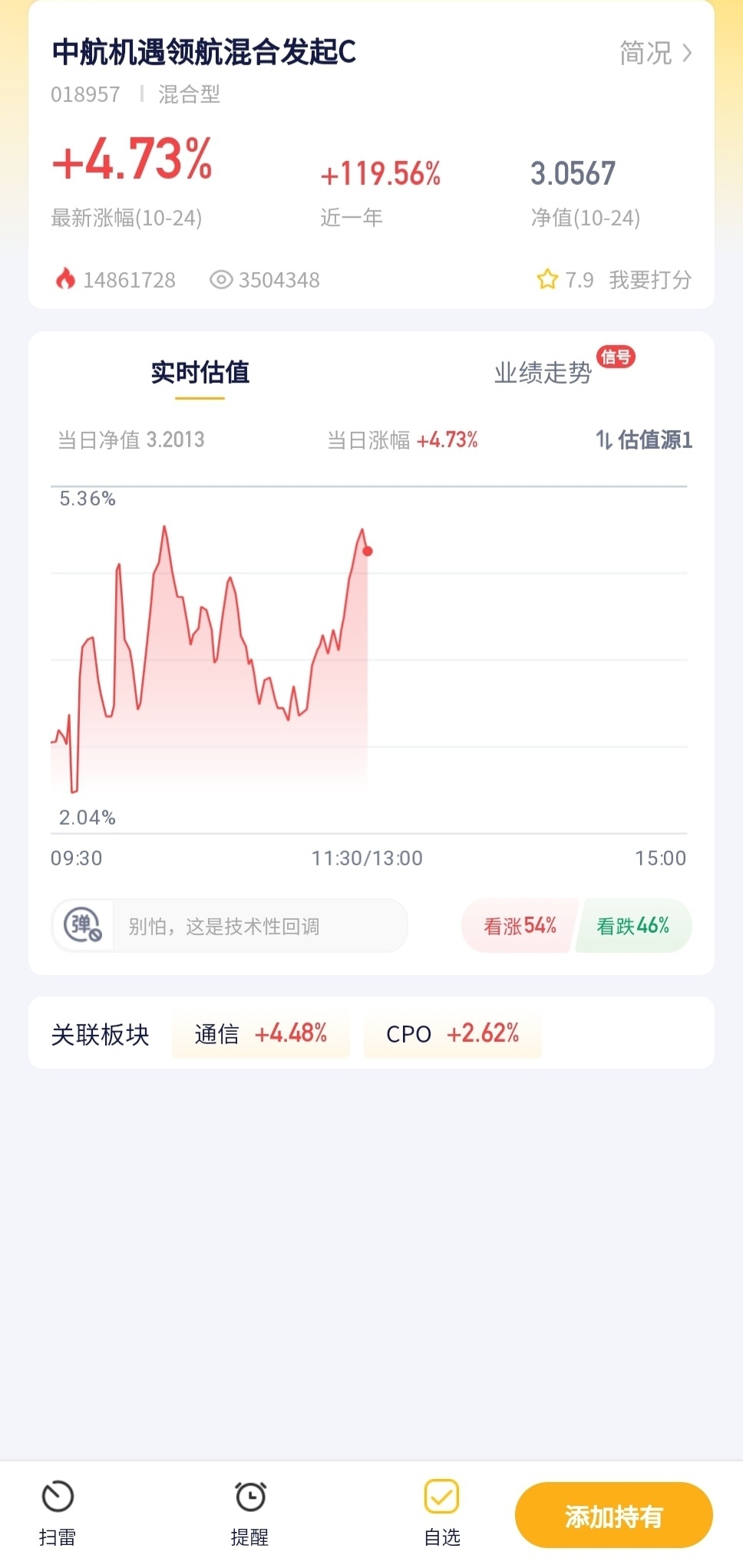 中航这只基金今天涨得给力,市场上机遇领航相关板块表现强势,带动它涨幅不错。