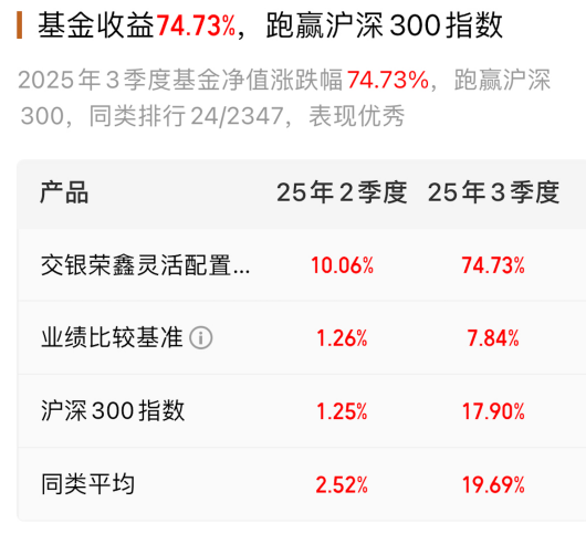 这只基主要配置算力和机器人等新兴赛道,爆发力很强劲,今年Q2涨幅10.06%,Q3涨了74.73%,远超业绩基准的7.84%,同类平均也只有19.69%,表现卓越。近一年来看涨幅已经翻倍,排名213位(总2249只)。而且这只基性价比挺高,近一年夏普比是3.47,优于99%的同类。