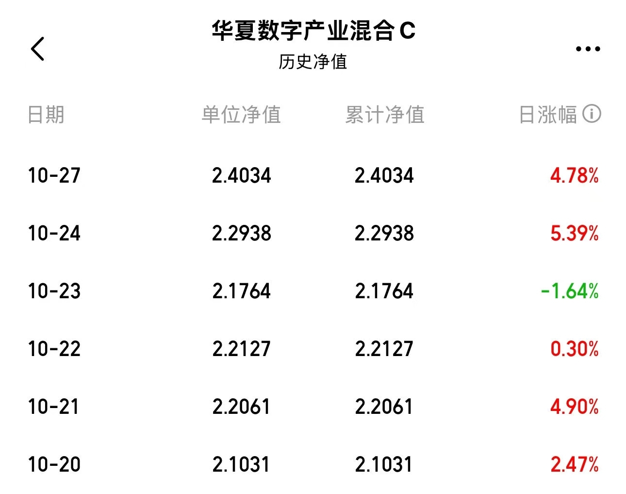 AI需求来带整个行业算力需求扩张,该基金重点布局海外算力、国产算力、大模型相关公司,昨天上涨4.78%突破新高,6天中5天正收益,继续拿$华夏数字产业混合C$