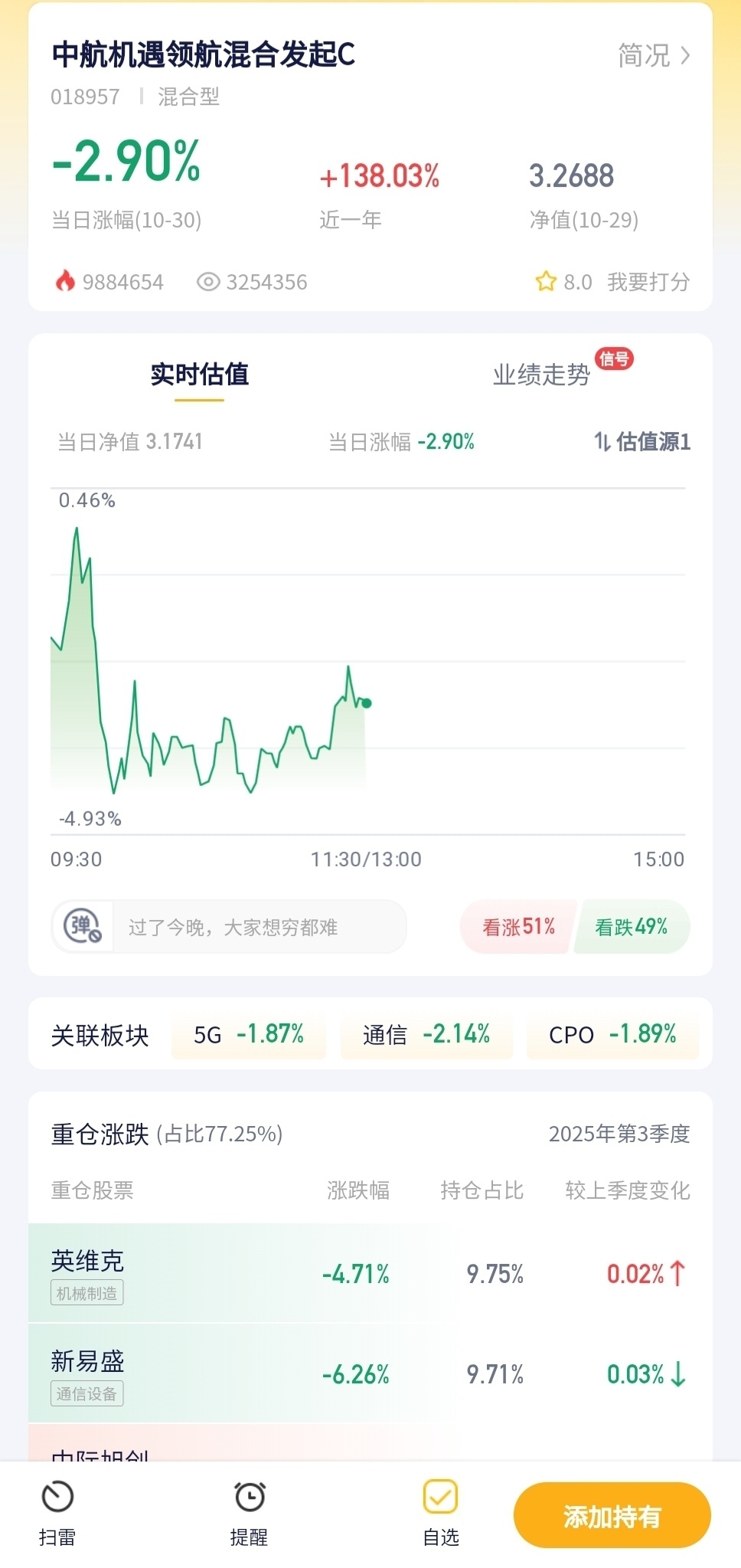 中航机遇领航混合发起C今日预估跌幅-2.90%!